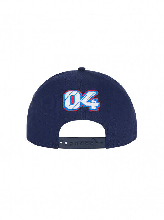 Flat cap from the official Andrea Dovizioso collection. Cap with blue base and 3D "Desmo Dovi" embroidery, on the back there is the number "04". Sticker on the visor.
