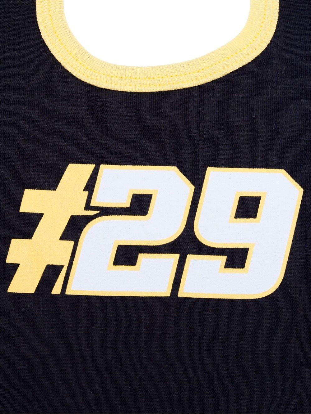 Baby’s Andrea Iannone bib. Black bib with yellow edging. The number 29 is featured in the centre. With button fastener at the neck.